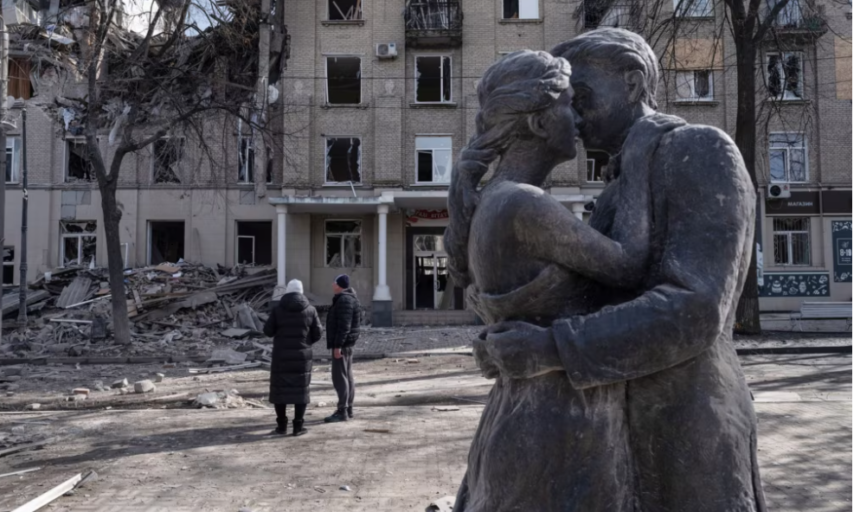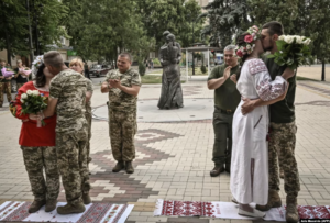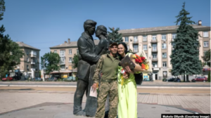 Në një ditë të kthjellët pranvere në qershor 2025, kameramani Mykyta Shapovalov e fotografoi një ushtar të sapomartuar me nofkën “Ujku” dhe gruan e tij Olena përpara një statuje të dy të dashuruarve duke u puthur në qytetin lindor të Druzhkivkës.